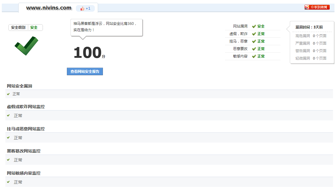 公司官網(wǎng)成功通過(guò)360網(wǎng)站安全在線(xiàn)檢測(cè),沒(méi)有發(fā)現(xiàn)任何漏洞,得滿(mǎn)分100。一個(gè)互聯(lián)網(wǎng)安全的模范~給你一個(gè)安全的上網(wǎng)環(huán)境。