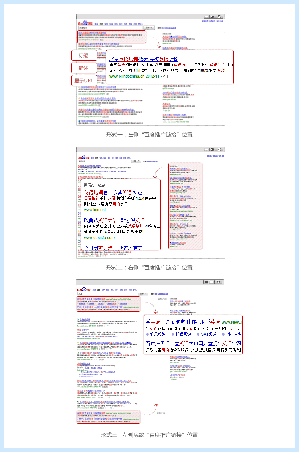 當企業(yè)推廣信息與網(wǎng)民需求高度吻合時,會在百度搜索結(jié)果頁以三種形式展現(xiàn)